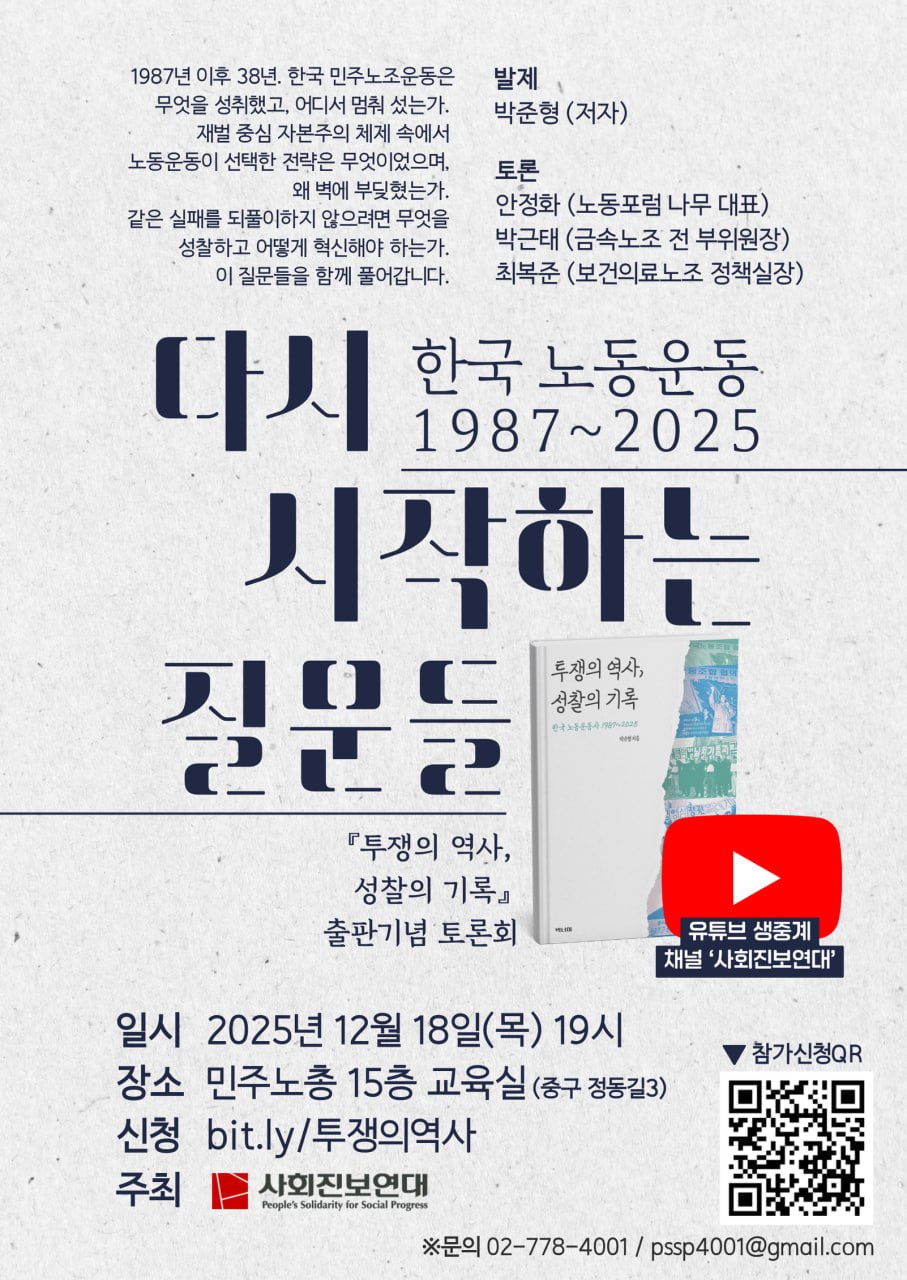 [%=사진1%] 『투쟁의 역사, 성찰의 기록: 한국 노동운동사 1987~2025』 지은이: 박준형 출판사: 벽너머 출간일: 2025.10.25. 1. 민주노총 30년, 역사를 ‘어떻게’ 기억할 것인가? 1985년 구로동맹파업 40주년, 1995년 민주노총 출범 30주년. 2025년은 노동운동사에서 여러모로 중요한 해다. 민주노총도 출범 30주년을 맞아 민주노조운동의 역사와 성과를 돌아보고, 앞으로의 30년을 새롭게 열어가기 위한 다양한 행사를 진행하고 있다. 지난 11월 15일, 전태일 열사 55주기를 맞아 열린 전국노동자대회 역시 민주노총 30주년 기념의 의미를 내세워 개최됐다. 민주노총은 자체적으로 『민주노총 30년사』를 출판했고, 11월 11일에는 30주년 기념식도 진행했다. 특별한 계기를 맞아 그동안의 걸음을 정리하는 과정은 소중하다. 특히 87년 노동자대투쟁을 이끌었던 선배 노동자 세대가 은퇴하고, 남은 세대가 새로운 운동의 흐름을 만들어가야 하는 지금, 과거에 대한 다양한 평가가 그 어느 때보다 필요한 시점이다. 이처럼 민주노총 30년의 역사를 기념할 필요성과는 별개로, 역사를 기억하는 방식과 그 내용의 한계에 대한 아쉬움과 우려의 목소리도 존재한다. 무엇보다 일부 간부들을 제외하면, 현장에서는 민주노총의 역사와 미래에 대한 진지한 논의가 거의 진행되지 않고 있으며, 조합원 상당수가 민주노총이 30주년을 맞았다는 사실조차 모르고 있는 게 현실이다. 이러한 상황에서, 박준형 공공운수노조 교육국장이 민주노총 출범 30주년을 맞아 『투쟁의 역사, 성찰의 기록: 한국 노동운동사 1987-2025』를 발간했다. 저자는 출판 후 인터뷰를 통해 “승리의 역사, 진군의 역사”라는 서술에서 벗어나 “한계를 돌아보고 향후 과제와 전망을 수립하기 위한” 시선으로 남한 노동운동사를 정리하고 싶었다고 밝혔다. 승리와 진군의 역사관은 지나온 30년을 되짚으며 서로를 격려하고 향후 운동을 함께 추동하는 데 의의가 있다. 그러나 안타깝게도 오늘날 한국 사회에서의 민주노총 위상을 고려하면, 30주년을 축하만으로 보내기에는 분명 부족함이 있다. 87년 노동자대투쟁을 통해 폭발했던 노동자들의 다양한 요구와 분노는 왜 이렇게 축소되었는가? 민주노총 창립선언문에서 밝힌 ‘산별교섭-노동자 정치세력화’라는 전략은 왜 후퇴했는가? ‘모든 노동자를 위한 민주노총’이 30년을 걸어온 사이에 노동자 간 격차와 사회적 불평등은 왜 더 확대되었는가? 이러한 물음에 답하고 새로운 길을 찾아가기 위해서는, 역사를 기억하고 기록하는 방식에 변화가 필요하다. 바로 이 지점에 『투쟁의 역사, 성찰의 기록』이라는 책의 가치가 있다고 생각한다. 이 책은 80년대 후반 이후 한국 노동운동이 겪어온 주요 사건들을 소개하면서, 각 사안에 대한 비판적 평가와 쟁점을 제기하고 있다. 성찰적 시선으로 바라본 노동운동의 지난 30여 년 역사 속 쟁점을 더 많은 사람과 함께 이야기하길 바라며 이 책을 소개하려 한다. 2. 성찰의 시선으로 본 30여 년 노동운동 투쟁의 역사 이 책은 6개의 장과 1개의 부록(좌담회)으로 구성되어 있다. 1980년대 이후 노동운동의 주요 사건과 쟁점을 시대순으로 서술하면서도 단순한 역사적 사실의 나열에서 그치지 않는다. 『투쟁의 역사, 성찰의 기록』이라는 책 제목에 나타나듯, 현재 노동운동이 처한 곤란이 어디에서 기인했는지에 대한 다양한 쟁점을 제기한다. 30여 년간 수많은 사람이 함께 만들어온 투쟁의 역사에 대한 성찰적 시선을 통해, 앞으로의 30년을 만들어가기 위해 탐색해야 할 다양한 질문을 던지고 있다. 1장은 1980년대 중반부터 1996~97년 민주노총 총파업까지의 시기를 다룬다. 1985년 구로동맹파업을 통해 형성된 정치적 노동자운동의 성장과 1987년 노동자대투쟁을 통해 터져 나온 대중적 분노를 그린다. 정치적 노동자운동과 대중적인 노동조합 조직이 결합하는 정점으로서 전노협 건설의 과정과 역사적 의의도 다룬다. 한편, 전노협에서 민주노총으로 조직이 재편되는 과정에서, 노동운동의 사회운동적 성격과 변혁적 이념이 옅어진 한계점과 그 이유에 대해 비판적으로 검토한다. 2장은 1997년 IMF 외환위기와 이에 맞선 노동운동의 방어투쟁을 다룬다. 노동운동이 정책적·이념적으로 준비되지 않은 상황에서 겪게 된 외환위기의 충격은 노동운동에 매우 큰 영향을 미친다. 특히 노사정 대화기구 참여를 두고 현재까지도 이어지는 첨예한 입장 차이, 노동시장 이중구조 고착화가 이때를 거치면서 구체적으로 형성됐다는 점에서, 이 시기 노동운동의 전략적 선택에 대한 면밀한 평가가 이뤄져야 함을 강조한다. 3장에서는 외환위기 이후 강화된 노동시장 이중구조를 해결하기 위한 민주노총의 다양한 시도와 전략을 비판적으로 평가한다. 고용구조, 기업규모에 따라 심화하는 노동자 간 격차와 불평등에 맞서 민주노총은 기업별 노조를 넘어 산별노조 전환을 통해 변화된 조건에 대응하려 한다. 그러나 민주노총을 구성하는 다수가 이미 외환위기에서 살아남은 대기업과 공공부문 노동조합이었던 상황에서 산별노조 추진은 현실적 난관에 부딪힌다. 다른 한 축으로 비정규직 노동자에 대한 ‘전략조직