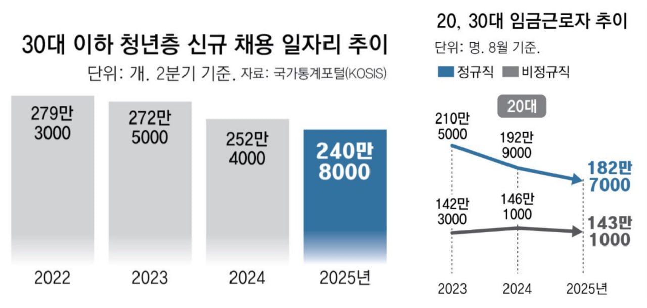 지난해 발표했던 「2025년 노동 정세전망」(《계간 사회진보연대》 2024년 겨울호)에서는 올해 노동시장을 전망하며 초고령화와 초저출산 사회로의 진입을 의미하는 고용 지표의 징후들을 확인하고, 저성장과 3중 부채, 대외무역의 불안정성이 노동시장 격차에 어떤 영향을 줄 것인지 논의한 바 있다. 2026년 노동 정세전망에서는 올해 주목했던 노동시장의 위기가 여전히 심화하고 있는 상황에서 노동시장의 구조적이고 장기적인 불안 요인들에 좀 더 주목하고자 한다. 1. 한국 노동시장의 구조적 불안 요인 1) 성장률은 반등했으나 여전히 심각한 고용 격차 2025년 3분기 성장률은 반등했지만, 한국경제 전반의 회복을 의미하지는 않는다. 최근 성장세는 반도체와 조선 등 일부 대기업 중심으로 나타난 회복세를 반영한 것에 불과하며, 수출 부문 내 양극화는 오히려 더 커졌다는 진단이 제기된다. 중소 제조업 부문은 신규 주문 감소, 설비투자 정체, 경기전망지수 하락 등 침체 국면을 벗어나지 못하고 있다. 내수의 성장률 기여 역시 정부 재정지출이 확대된 영향이 크다. 최근 서비스업 고용의 양적 확대도 저임금, 저생산성 업종이 중심이어서 경제 전체의 생산성 향상과 고용의 질 개선으로는 이어지지 못한다. (자세한 내용은 이번 호에 실린 정성진의 글을 참고하라) 이러한 경제적 불균형은 올해 산업별, 지역별 고용 위기로도 드러났다. 미국 트럼프 행정부의 관세 정책 여파로 철강과 중화학공업을 중심으로 제조업 기반이 흔들리면서, 경북 포항과 충남 서산이 잇달아 “고용 위기 선제 대응 지역”으로 지정되었다. 이는 지난 8월 전남 여수와 광주 광산구가 지정된 데 이어 제조업 중심 지역의 고용 위기가 확산하고 있다는 사실을 보여준다. 노동부는 직업훈련비, 생계비 대부, 고용유지지원금 확대 등 각종 대응책으로 지역 고용 위기를 선제적으로 방어한다는 계획이지만, 이미 산업의 위기가 인구 감소와 지방 소멸 위기 등 복합적 요인과 중첩되어 고용 충격으로 이어지고 있는 상황이다. 한편, 청년층 신규 채용 일자리 지표는 심각한 내림세에 있다. 최근 국가통계포털(KOSIS)에 따르면, 임금 근로 일자리 중 20~30대 신규 채용은 2025년 2분기 기준 240만 8천 개로, 작년 같은 기간보다 11만 6천 개나 감소했다. 이는 2018년 관련 통계 작성 이래 2분기 기준 가장 적은 수준이다. 청년 신규 채용은 2022년 279만 3천 개에서 2023년 272만 5천 개, 지난해 252만 4천 개 등으로 3년째 감소세를 이어가고 있다. 특히 제조업과 건설업에서만 8만 개의 신규 일자리가 감소했는데 이는 전체 청년층 신규 채용 감소분 중 약 70%를 차지하는 규모다. 특히 이 부문은 비교적 일자리 창출 여력이 크고 안정적인 임금 근로 분야라는 점에서 신규 일자리 창출이 상당히 저조하다는 사실을 알 수 있다. [%=사진1%] 30대 이하 청년층 신규 채용 일자리 추이와 20대 임금근로자 추이 오른쪽 20대 임금근로자 추이에서 위쪽 그래프가 정규직, 아래쪽 그래프가 비정규직을 나타낸다. 전체적으로 청년층 신규 채용 일자리 수가 감소하는 가운데, 특히 청년층 정규직 수가 급감하고 있음을 볼 수 있다. (자료출처: 《동아일보》) 취업 문턱을 넘더라도 청년층의 고용은 불안정하다. 통계청 발표에 의하면, 2025년 8월 기준 20~30대 임금노동자 중 비정규직 비중은 31.7%로 2004년 이후 최고치를 기록했으며, 기간제 고용 비중 역시 2015년 12.7%에서 2025년 19.6%로 급증했다. 이처럼 올해 한국의 노동시장은 산업, 지역, 세대별 고용 기반이 더 취약해졌다. 특히 기업의 투자가 위축되며 신규 일자리를 만들어내지 못하고, 청년들이 양질의 노동시장으로 진입하기 어려워져 청년층 고용 한파가 장기화할 것이라는 우려가 나온다. 2) 낮은 실업률의 이면: 매칭효율성 증가와 청년 ‘쉬었음’ 인구의 비노동력화 통계청이 발표한 『2025년 10월 고용동향』에 따르면, 전체 고용률은 70.1%로 전년 동월 대비 0.3% 상승했다. 실업률은 2.2%로 –0.1% 하락했으며, 전체 취업자 수는 2904만 명으로 전년 동월 대비 19.3만 명(0.7%) 증가했다. 반면 비경제활동인구 중 20~30대 ‘쉬었음’ 청년의 증가가 여전히 두드러졌다. 특히 30대의 ‘쉬었음’ 인구는 22년 만에 최고치를 기록했다. 서비스, 보건복지, 고령자 친화 업종 중심의 고용이 낮은 실업률을 견인하고 있는 양상이다. [%=사진2%] 취업자 증감 전체 추이와 연령별, 산업별 추이 (자료출처: 《뉴시스》) 최근 주요 기관 연구보고서에서는 한국경제의 장기 저성장에도 불구하고 실업률이 낮게 유지되는 원인을 여러 측면에서 분석하고 있다. 국제통화기금(IMF)은 팬데믹 이후 경제개발협력기구(OECD) 주요국 중 한국에사 가장 낮은 실업률이 유지되고 있는 원인을 분석한다. 표면적으로는 경기회복과 정부의 고용지원 정책이 주요한 원인으로 보이지만, 실질적인 원인은 한국 노동시장 내부의 변화를 주목해야 한다고 주장하며 특히 매칭효율성 향상이 핵심 요인임을 강조한다. ‘매칭효율성’(matching efficiency)은 노동시장 안에서 ‘구직자’와 ‘빈 일자리’가 얼마나 효과적으로 연결되는가를 나타내는 지표로, 매칭함수에 의해 정의된다. 이는 구