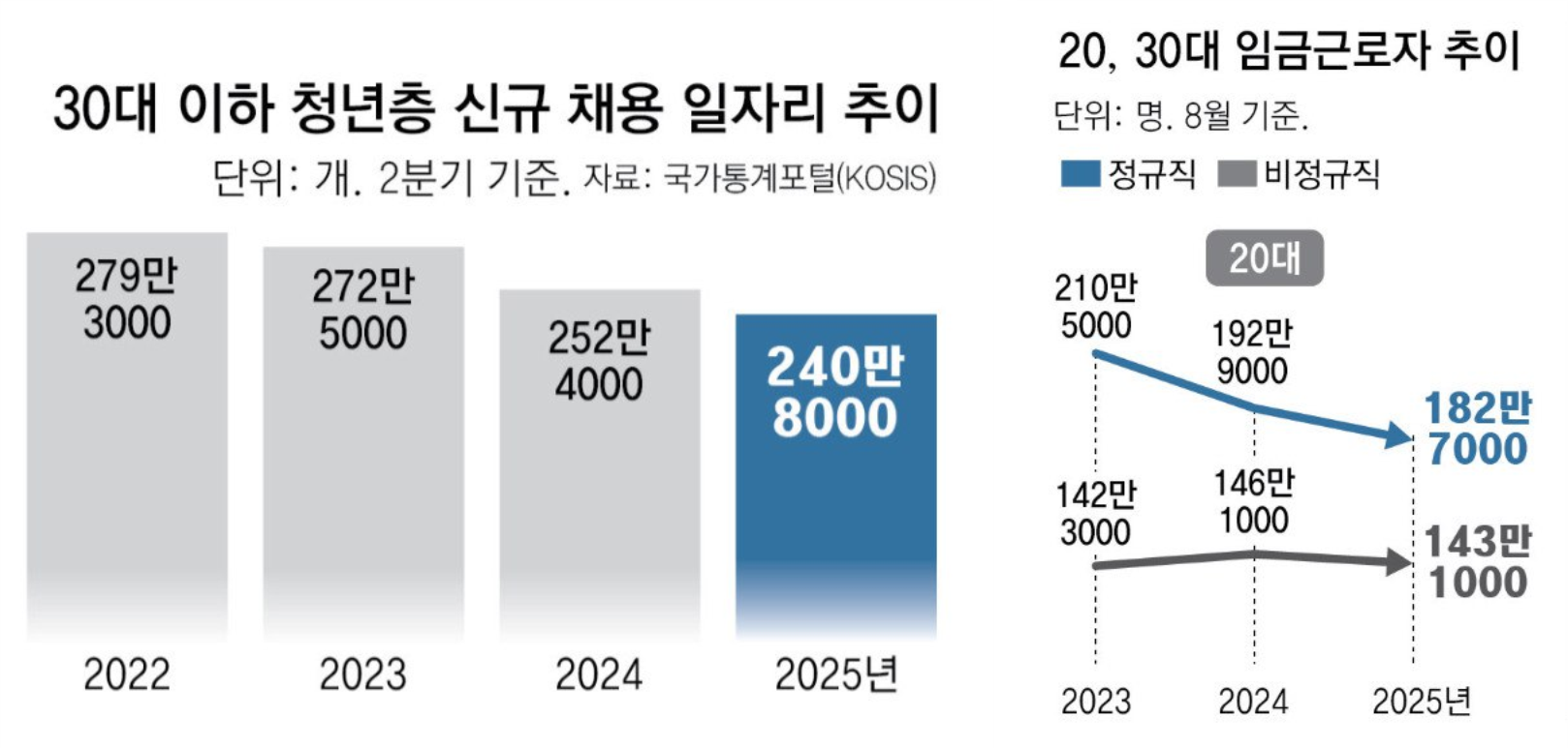 취업 문턱을 넘더라도 청년층의 고용은 불안정하다. 통계청 발표에 의하면, 2025년 8월 기준 20~30대 임금노동자 중 비정규직 비중은 31.7%로 2004년 이후 최고치를 기록했으며, 기간제 고용 비중 역시 2015년 12.7%에서 2025년 19.6%로 급증했다. 이처럼 올해 한국의 노동시장은 산업, 지역, 세대별 고용 기반이 더 취약해졌다. 특히 기업의 투자가 위축되며 신규 일자리를 만들어내지 못하고, 청년들이 양질의 노동시장으로 진입하기 어려워져 청년층 고용 한파가 장기화할 것이라는 우려가 나온다.