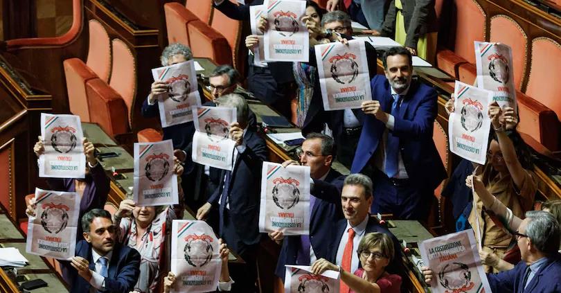 7월 22일 이탈리아 사법부 개혁을 위한 헌법 개정안 통과 표결을 앞두고 상원에서 민주당(PD) 의원들이 이탈리아 헌법전 표지 사진을 거꾸로 들며, 개정안 통과 반대의 뜻을 표현하고 있는 장면. 사법부 개혁안의 구체 내용은 “김영진, 「주류가 된 유럽 포퓰리즘: 포퓰리즘은 어떻게 민주주의를 위협하는가?」, 《계간 사회진보연대》 2025년 여름호”를 참고할 수 있다. (출처: 《Il Sole 24 Ore》)