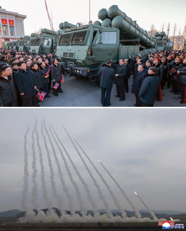 북한 조선중앙통신은 김정은 위원장이 참석한 가운데 “군수노동계급이 조선노동당 제9차대회에 드리는 600mm 대구경 방사포 증정식이 2026년 2월 18일 평양에서 성대히 거행”됐다고 보도했다. 그리고 김정은 위원장이 참관한 가운데 3월 14일 600mm 초정밀다연장방사포 12문의 타격훈련을 진행했다고 보도했다. (출처: 조선중앙TV)