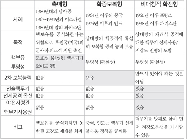 (출처: Vipin Narang, Nuclear Strategies of Emerging Nuclear Powers: North Korea and Iran, The Washington Quarterly, Spring 2015.) |
